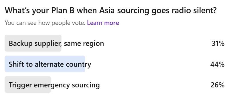 Last week I asked you what your Plan B is when Asia sourcing goes radio silent. The poll results looked neat: